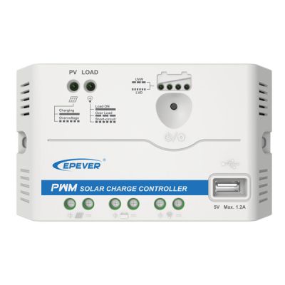 Der medfølger en PWM solcelleregulator på 10 A/20 A til opladning af 12V batteri. Panelet har også direkte USB-udgange til opladning af mobiltelefoner mm.