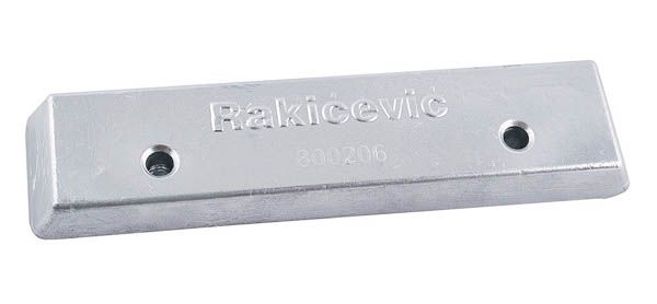 Udvendige mål: L175 * B39 * H19 mm Hulafstand: 100 mm Hul: 7 mm Vægt: 0,815 kg. Rakicevic Nautical Anodes produceres i Europa med brug af de bedste og reneste råmaterialer, der alle opfylder MIL-A-18001K standarden og indeholder zink med renhed på mindst 99,55%