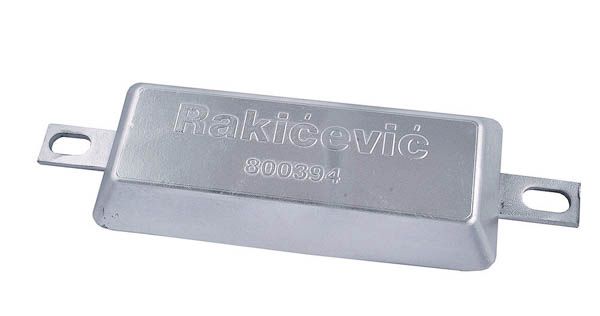 Længde total: 300 mm Længde zink: 215 mm Bredde: 94 mm Højde: 31 mm Hulafstand: 267 mm Hul: 20 * 12 mm Vægt: 3,500 kg. Rakicevic Nautical Anodes produceres i Europa med brug af de bedste og reneste råmaterialer, der alle opfylder MIL-A-18001K standarden og indeholder zink med renhed på mindst 99,55%