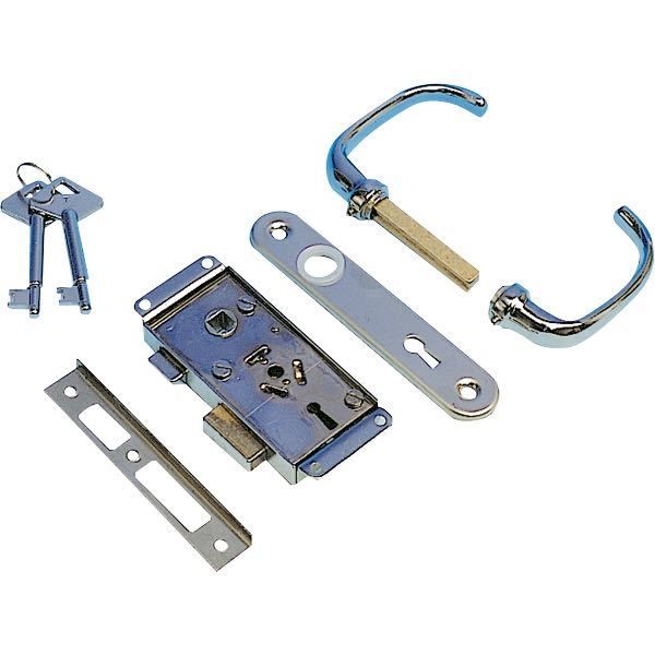 Låsekasse til døre i både, som monteres på døren. Der medfølder 2 stk nøgler, 1 dørskilt og vridet. Låsekassen er 113 x 46 mm.
