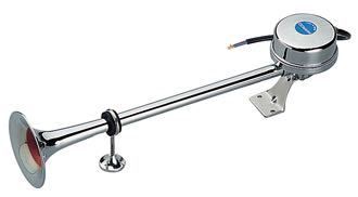 Forkromet messinghorn med total tæt søvandsbestandigt hornhus på stålfod med tragtholder og relæ.