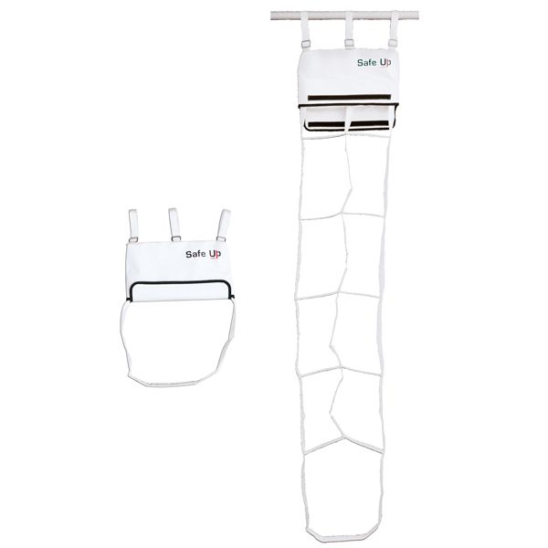 Sikkerhedsstigen ligger i en hvid canvas taske med 2 håndtag.