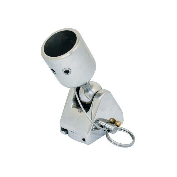 Aftageligt dæksbeslag. Udtag fast pinden og besaget kan glides af lav profilet. På dæksbeslaget er der et top beslag med kuglehoved monteret.