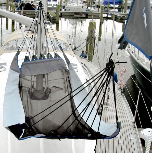 Letvægts-hængekøje. 210 x 100 / 120 cm Det unikke design af denne hængekøje gør den meget velegnet til bådlivet. Den har en midtersektion i mesh-stof for maksimal komfort, en forstærket kant for holdbarhed og webbing paneler for ekstra styrke. Sådan gør du: Fastgør den ene ende af hængekøjen til spilerstageøjet på masten (eller til et fald) ved hjælp af den medfølgende softshackle. Den anden ende fastgøres med monteringstrekanten til et fald, og en line føres modsat fra monteringstrekanten ned til et egnet beslag i dækket. Sådan! Nu kan du bare slappe af.