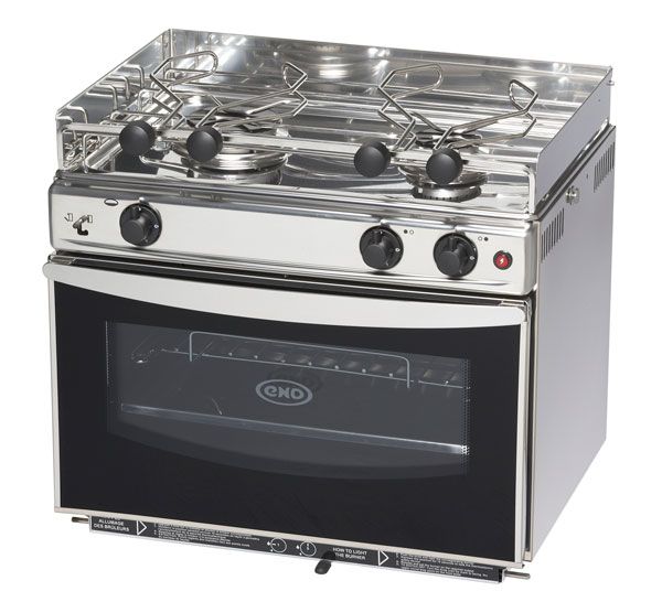 ENO?s ?best seller komfur?, standard-version. Højpoleret marinekomfur med el-tænding, med 2 blus på 1750 og 2500 W., og ovn på 1800W Ovnen rummer hele 26 L. Ovndør med dobbeltglas og børnesikring/lås. Balanceophæng, 2 sæt rustfri grydeholdere og balancelås er standard. Leveres med 3 sidet rustfri flamme-/stænk ?ocean? kant, der kan fjernes. Mål: B505 x D430 x H460 (470 med flammekant) (Passer i mål med ?gamle komfurer?) Vægt: 25 kg