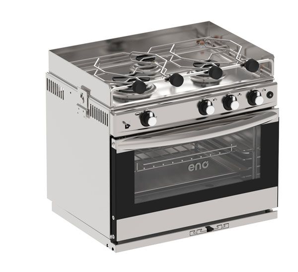ENO 3-blus komfur, standard-version. Har samme mål og udstyr som Open Sea 2-blus, blot med et tredje mindre blus i bagkant af toppladen på 1000W. Mest anvendeligt til en lille sovsekande eller 3 mindre gryder og som simreblus. Højpoleret marinekomfur med el-tænding, med 3 blus på hhv. 1000W, 1750W og 2500W. Ovnen er på 1800W og rummer hele 26 L. Ovndør med dobbeltglas og børnesikring/lås. Balanceophæng, 2 sæt rustfri grydeholdere og balancelås er standard. Leveres med 3 sidet rustfri flamme-/stænk ?ocean? kant, der kan fjernes. Mål: B505 x D430 x H460 (470 med flammekant) (Passer i mål med ?gamle komfurer?) Vægt: 26 kg