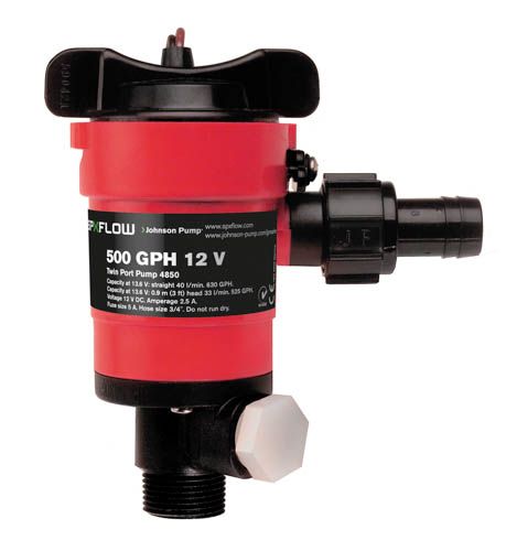 Johnson pumpe til agnbox Kan både fylde og cirkulere. Pumpen har 3/4 tomme indtag for både agnbox og videre til spulepumpe. Kapacitet ved 1 meter løftehøjde: 40 liter pr. minut