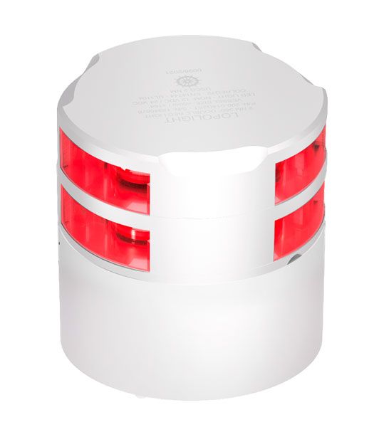 Dobbelt signallanterne med 360? rødt lys. Farve: hvid. Lys: Rødt. Til horisontal montage. Har en rækkevidde på 2 nm (2 sømil) Passer til både på 0-20m. Til 12/24V. Kabel på 0,75m medfølger. Certificeret og overholder alle standarder. 100% vandtæt (IP68) aluminiumshus. 5 års garanti. Mål: Ø92,5mm x 96,5mm Vægt: 0.88 Kg