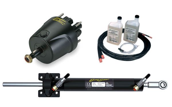 BayStar Inboard hydraulikstyring. Komplet sæt inkl. pumpe, cylinder, 2 x 20 fod slange og 2 liter olie. Max bådstørrelse 18 fod Ratomdrejninger: 2,5. Max. tryk cylinder 30 Kg/m. Slaglængde: 15 cm. Volumen: Ratpumpe 23 cm3, cylinder 58 cm3.