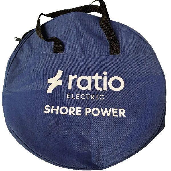 Praktisk blå nylon taske med lynlås til forlængerkabel.