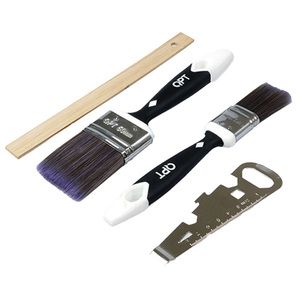 Qpt Penselsæt bestående af 2 flade pensler + bøtte åbner. Lakpensel 1 stk. 30mm og 50mm syntetiske børster og gummihåndtag.