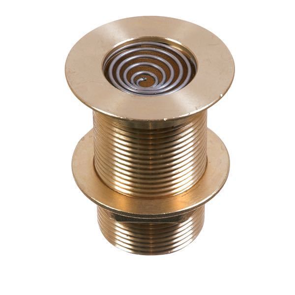 Messing skroggennemføring med fjedersi som kan plansænkes i skroget og dermed fungere som afløb i cockpittet.