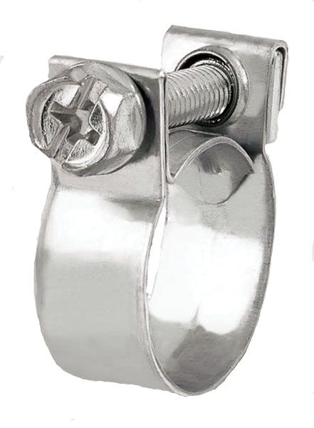 Alle dele er lavet af rustfrit stål SS 2333/AISI 304. Spændebåndets forhøjede kanter beskadiger ikke slangen Tungen på spændebåndet er forstærket ved stempling. Den krympede møtrik forbliver på plads selvom skruen er løsnet helt.