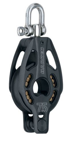 Max line Ø14mm. Længde: 157mm. Skive: Ø75mm SWL: 2268 kg. Brudstyrke: 4536kg. Vægt: 363g Harkens Black Magic blokke er stærke, lette og letløbende, og kaldes også for Harkens arbejdsheste på grund af deres høje styrke-/ vægtforhold, og ekstremt lette løb. Det er must have- blokken, uanset om du sejler lokalt eller globalt. Med Torlon rulleleje. Delrin kugler i siderne tager belastningen sideværts. Sideplader og skive er hård-anodiseret og Teflon- belagt aluminium. Kan skilles helt ad ved at løsne tre skruer, uden løse kugler.