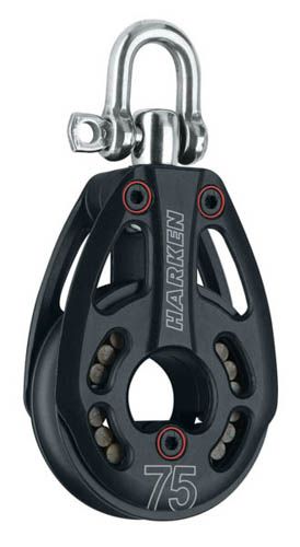 Max line Ø14mm. Længde: 129mm. Skive: Ø75mm SWL: 1361 kg. Brudstyrke: 2722kg. Vægt: 335g Harkens Black Magic blokke er stærke, lette og letløbende, og kaldes også for Harkens arbejdsheste på grund af deres høje styrke-/ vægtforhold, og ekstremt lette løb. Det er must have- blokken, uanset om du sejler lokalt eller globalt. Med Torlon rulleleje. Delrin kugler i siderne tager belastningen sideværts. Sideplader og skive er hård-anodiseret og Teflon- belagt aluminium. Kan skilles helt ad ved at løsne tre skruer, uden løse kugler.