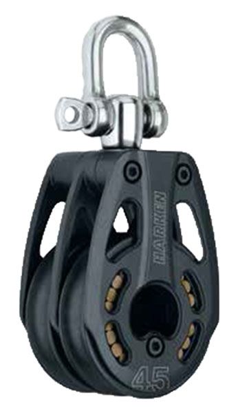 Max line Ø10mm. Længde: 106mm. Skive: Ø45mm SWL: 1100 kg. Brudstyrke: 2200kg. Vægt: 195g Harkens Black Magic blokke er stærke, lette og letløbende, og kaldes også for Harkens arbejdsheste på grund af deres høje styrke-/ vægtforhold, og ekstremt lette løb. Det er must have- blokken, uanset om du sejler lokalt eller globalt. Med Torlon rulleleje. Delrin kugler i siderne tager belastningen sideværts. Sideplader og skive er hård-anodiseret og Teflon- belagt aluminium. Kan skilles helt ad ved at løsne tre skruer, uden løse kugler.