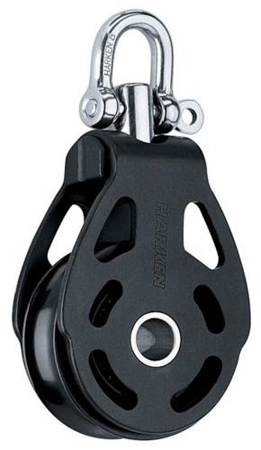 Harken ESP 100 mm Enkeltblok med svirvel Harken ESP 100 mm enkeltblok med svirvel Sider i aluminium. Med kugleleje til lette belastninger og glideleje til tunge statiske belastninger. Maks. Arbejdsbelastning 2.209 kg. Brudstyrke 4.418 kg. ESP er en serie af blokke der komplementer de øvrige Harken serier i design og funktion, men er enkle i design og konstruktion. Skiven har Carbon Delrin-kugler, der tager den lette belastning horisontalt samt sideværts. Ved høje statiske belastninger optages disse af det store rustfri centerglideleje. ESP er ideelle som fx mastefodsblokke og findes i mange varianter.