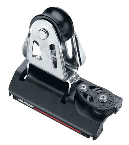 Genuavogn med enkelt trimblok. Til Harkens 22 mm CB skinner. Vognen er CNC-fræset i ?t stykke UV-stabiliseret, hardlube- anodiseret 6061-T6 aluminium. Med CB (Captive Ball) kuglelejer med 60 stk. Ø6 Torlon kugler. Bredde: 57 mm. Længde: 105 mm. Vægt: 365 g. SWL: 567 kg. Brudstyrke: 1.134 kg. Skive: ESP Ø38 mm. Kan vippe op til 60 grader.