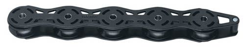 Harken ESP fordelerblok i aluminium med 5 stk. 57 mm skiver med kuglelejer ESP er en serie af blokke der komplementer de øvrige Harken serier i design og funktion, men er enkle i design og konstruktion. Skiven har Carbon Delrin-kugler, der tager den lette belastning horisontalt samt sideværts. Ved høje statiske belastninger optages disse af det store rustfri centerglideleje. ESP er ideelle som fx mastefodsblokke og findes i mange varianter.