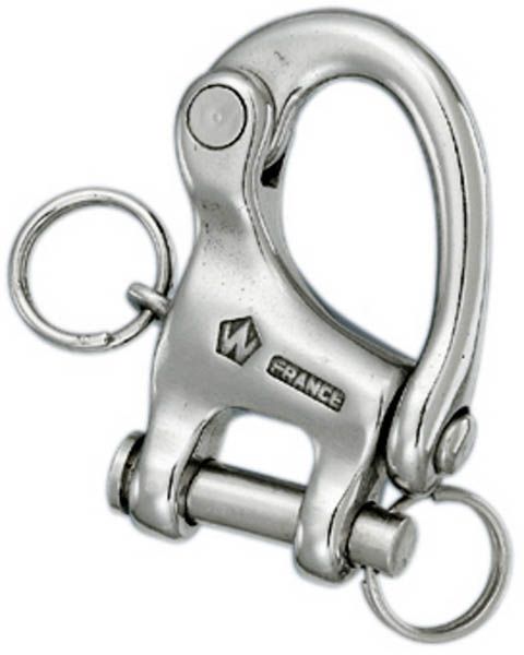 Høj brudstyrke - HR rustfri stål 17.4 PH Skøde krog med Ø 6 mm pin, øje 16 mm Funktionsbelastning 960 kg - Brudstyrke 2000 kg Alle Wichard's snapsjækler er forsynet med en captive låsepind, dvs. at låsepinden under ingen omstændigheder kan falde ud, hvilket er en høj sikkerhedsfaktor. Snapsjæklerne fås i mange forskellige versioner, som med fast øje, med svirvel med gevind, med kovs, til webbing osv.