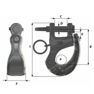 Høj brudstyrke - HR rustfri stål 17.4 PH Bred snapsjækel. A: Ø8 mm, C: 13 mm, D: Ø6 mm (pin), E: 5,1 mm, F: 19 mm, L: 54 mm. Funktionsbelastning 960 kg - Brudstyrke 2000 kg Alle Wichard's snapsjækler er forsynet med en captive låsepind, dvs. at låsepinden under ingen omstændigheder kan falde ud, hvilket er en høj sikkerhedsfaktor. Snapsjæklerne fås i mange forskellige versioner, som med fast øje, med svirvel med gevind, med kovs, til webbing osv.