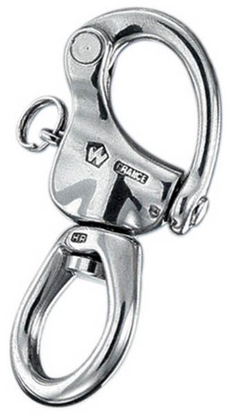 Høj brudstyrke - HR rustfri stål 17.4 PH Øje 19 mm, gab 16 mm Funktionsbelastning 960 kg - Brudstyrke 2000 kg Alle Wichard's snapsjækler er forsynet med en captive låsepind, dvs. at låsepinden under ingen omstændigheder kan falde ud, hvilket er en høj sikkerhedsfaktor. Snapsjæklerne fås i mange forskellige versioner, som med fast øje, med svirvel med gevind, med kovs, til webbing osv.