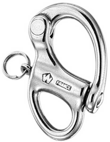 Høj brudstyrke - HR rustfri stål 17.4 PH Øje 10 mm, gab 16 mm Funktionsbelastning 960 kg - Brudstyrke 2000 kg Alle Wichard's snapsjækler er forsynet med en captive låsepind, dvs. at låsepinden under ingen omstændigheder kan falde ud, hvilket er en høj sikkerhedsfaktor. Snapsjæklerne fås i mange forskellige versioner, som med fast øje, med svirvel med gevind, med kovs, til webbing osv.