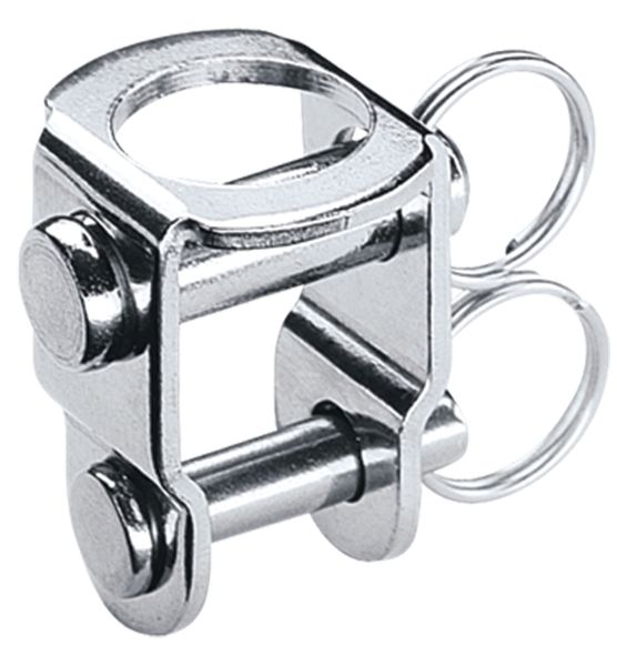 Svirvel adapter til blok. Rustfri stål. Pins: Ø5/ 6 mm. Afstand ml. pins: 14 mm. Indre bredde: 10 mm. Funktionsbelastning: 567 kg. Brudstyrke: 1.134 kg Vægt: 16,3 g.