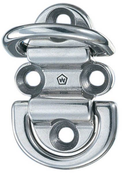 Dobbelt foldbart padeye med 4 skruehuller. A: 45 mm, B: 27 mm, C: 14 mm, Ø d: 6,4 mm, E: 75 mm, F: 59 mm. 316L rustfri stål. Vægt: 126 g. Funktionsbelastning 1.440 kg - Brudstyrke 2.500 kg. Wichard's foldbare padeyes er stærke, multianvendelige og fås i mange varianter. Du kan bruge dem til babystag, fastgørelse af blokke, livliner eller andet. Ved midlertidig anvendelse kan pad eyes selvsagt foldes ned. En lille pakning af silikonegummi sørger for, at et Wichard padeye ikke lader sig påvirke af vibrationer, og det er støjfrit.