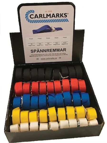Sortiment med 45 stk. spændestropper i fem forskellige farver / længder. 9 af hver model. 9 stk. hvide 1 m 9 stk. gule 1,5 m 9 stk. blå 2,0 m 9 stk. røde 2,5 m 9 stk. sorte 3,0 m