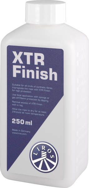 LIROS XTR-Finish coating der beskytter mod slid og mod UV-stråler på polyester, Dyneema og Zylon. Leveres i 250 ml plastflaske