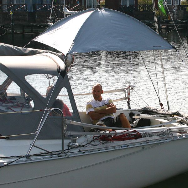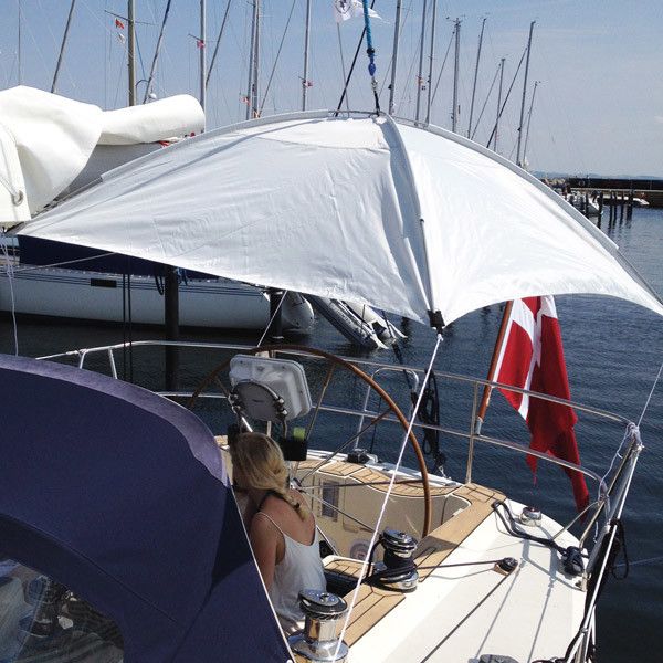Selvom solen kan være en sjælden gæst, er den ekstra stærk på havet, hvor den også reflekteres fra havets overflade. Praktisk selvbærende sol eller regn-cover som meget enkelt hænges op i faldet. Justerbare bånd i alle hjørner. Monteres enkelt på et par minutter. Spændes ud med stænger med indbygget elastik. Tager ikke meget plads når den er foldet sammen.