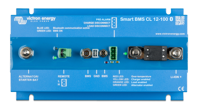 Smart BMS CL 12/100 er et batteri-styringssystem til Victron lithium (LiFePO4) Smart batterier. Den er designet specielt til 12V-systemer med en 12V-generator.BMS CL 12/100 overvåger og beskytter hver enkelt batteri-celle inden i batteriet (eller batteri-banken) og kobler generatoren, batteriladere eller DC-belastninger fra i tilfælde af lav batterispænding, høj batterispænding eller over temperatur.Det dedikerede generatorinput giver en begrænsning af strømmen og envejstrafik fra generatoren til batteriet, så enhver størrelse generator (og startbatteri) kan forbindes sikkert til Smart Lithium-batteriet.BMS er også udstyret med en Remote tænd-sluk funktion, for at slukke BMS'en (og systemet) via en fjernbetjening og en pre-alarmkontakt, for at give et advarselssignal, før BMS vil afbryde forbindelsen mellem batterierne og systemet og dermed lukke ned.