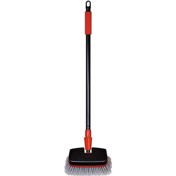 Børstehoved med vandkammersystem, beskyttende gummikanter og skråtstillede børstehår.