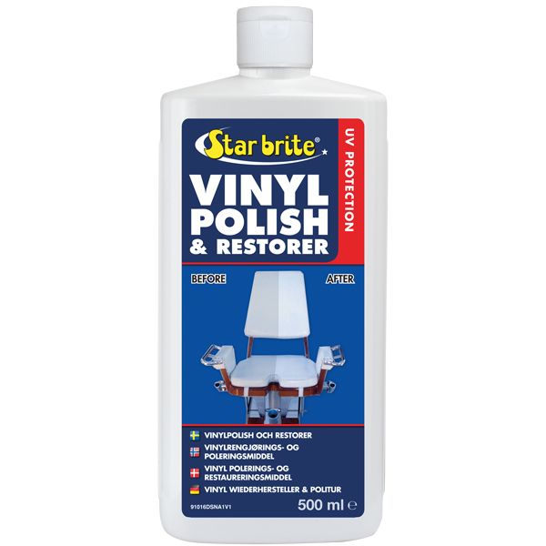 Star Brite Vinyl Polish & Restorer er et polerings- og restaureringsmiddel, der fornyer alle vinyloverflader og giver beskyttelse mod UV-skader og vejrforhold. Polermidlet er id?elt til opfriskning af falmet og beskidt vinyl.Anvendelse1. Vask løstsiddende snavs væk med Star Brite Vinyl Cleaner2. Omryst flasken grundigt. Brug en ren og tør klud til at påføre Star Brite Vinyl Polish & Restorer på et lille område. Gnid i en jævn, overlappende cirkelbevægelse for at sikre en ensartet dækning. Det kan være nødvendigt med flere påføringer for at genoprette overfladen. 3. Brug en anden ren og tør klud til at polere vinylen, til den får en skinnende finish. Star Brite Vinyl Polish & Restorer vil gøre vinylen blød og smidig og forlænge dens brugstid.